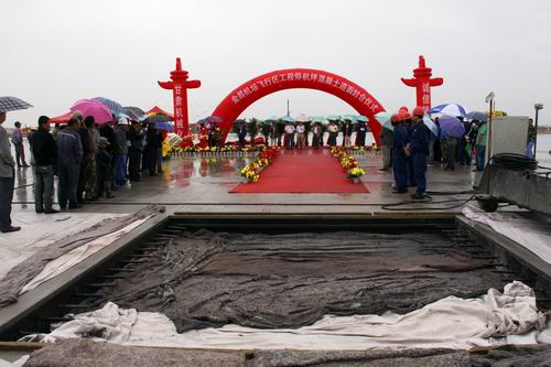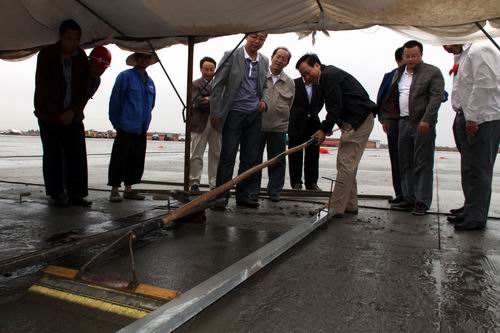 由公司承建的金昌機(jī)場停機(jī)坪工程按4C標(biāo)準(zhǔn)設(shè)計(jì),站坪機(jī)位4個(gè)(2B2C),總面積2.65萬平方米,可供波音737和空客320等機(jī)型的起降。該項(xiàng)工程自2009年10月進(jìn)場,公司金昌機(jī)場項(xiàng)目部全體人員在高溫酷暑、大風(fēng)揚(yáng)沙等惡劣氣候條件下,克服種種困難,通過改進(jìn)施工工藝、調(diào)整作業(yè)時(shí)間等措施,順利完成了基礎(chǔ)施工。項(xiàng)目部僅用了25個(gè)晝夜就完成停機(jī)坪2.65萬平方米混凝土道面工程施工。